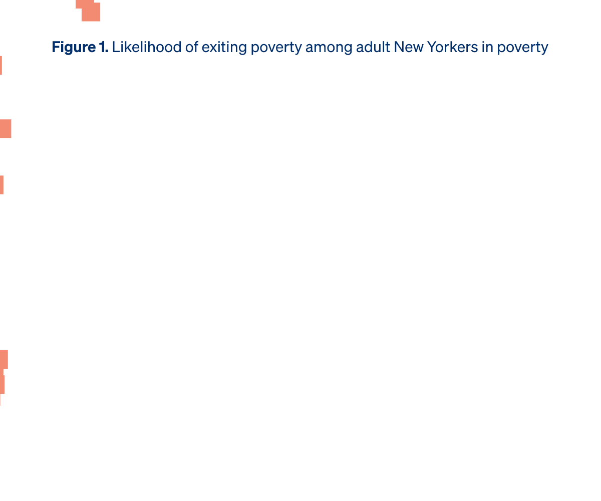 Looking at subsequent years of data, we are also able to examine whether New Yorkers who exit poverty stay out of poverty long-term, or if their stays above the poverty line are more often short-lived. We find that a majority of adult New Yorkers who exit poverty soon fall back below the poverty line, with more than half (53%) falling back into poverty within two years of their exit (Figure 2). The remaining half (47%) who exit poverty continue to remain above the poverty line in the following two years.