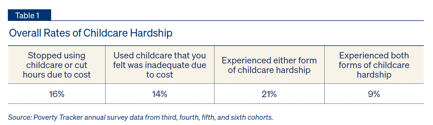 - Roughly 15% of parents experienced each form of childcare hardship, and more than one-fifth (21%) experienced at least one form.