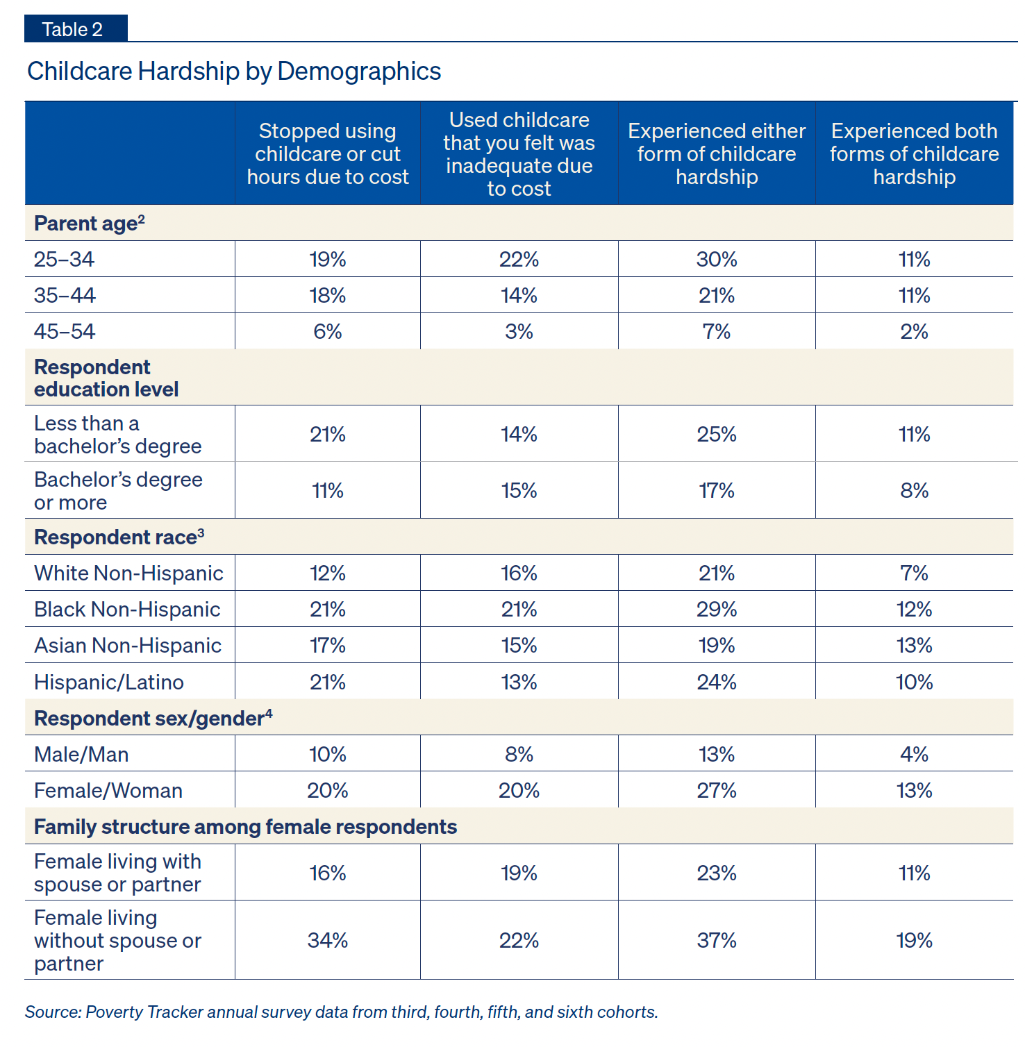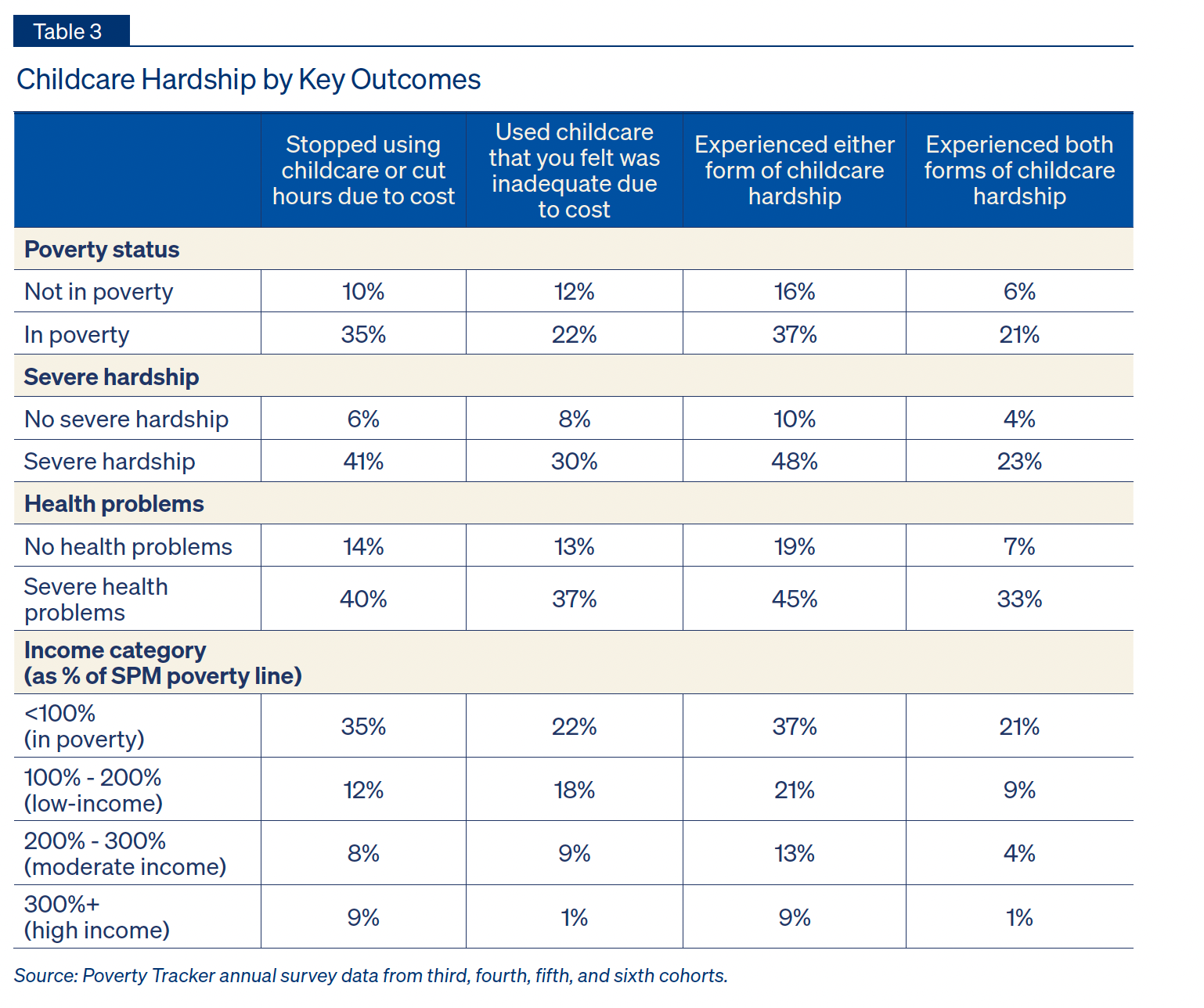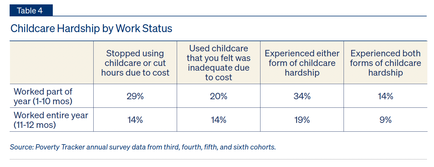 Finally, Table 4 investigates how childcare hardship varies based on parental work status. For families with two parents, we use the work status of the parent who worked the greatest number of months in the year. What stands out here is that hardship rates are higher among parents who worked for ten months or fewer (34%) than among parents who worked for the entire year (19%). The dynamic underlying this trend is likely two-faceted: parents who experience difficulty accessing childcare may be unable to work consistently through the year, and this inconsistent work schedule may in turn make securing reliable childcare more difficult.