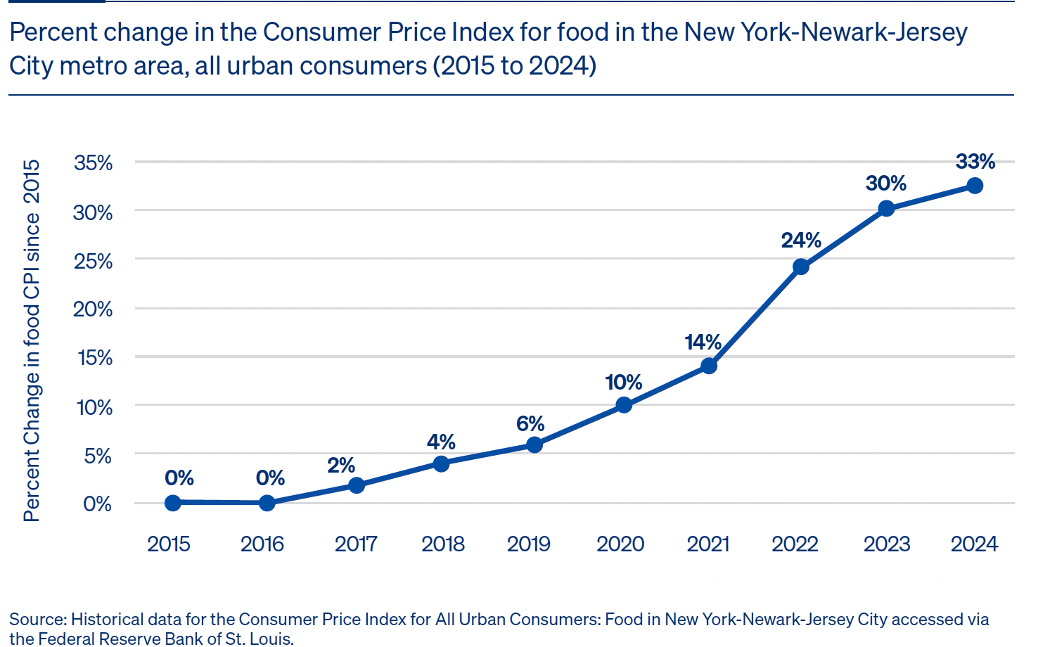 New Yorkers’ ability to afford food has been impacted by rising prices, with food costs in the New York City metropolitan area increasing by 33% over the last decade. The report finds that food budget shortfalls are affecting New Yorkers across the income distribution, including those well above the poverty line. Among families with children facing food budget shortfalls, the average amount of additional money needed per week has increased from $171 pre-pandemic to $205 in recent years.