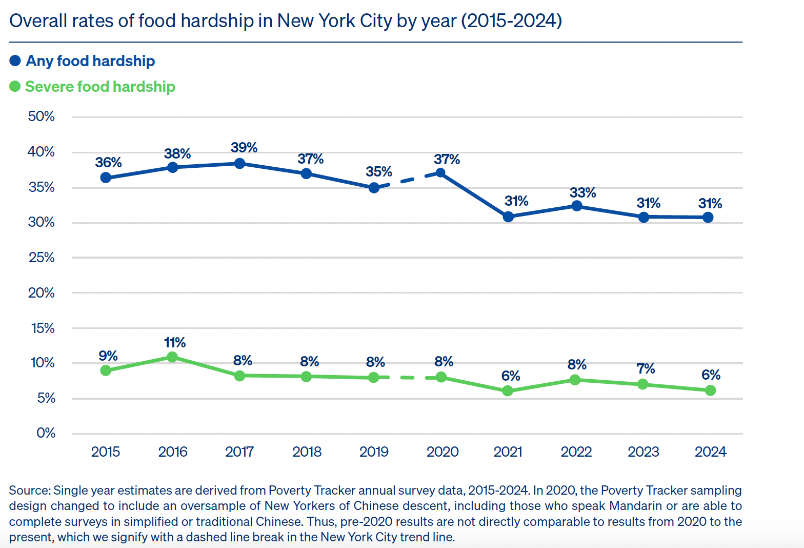 Poverty Tracker research has shown that stable access to affordable, healthy, and nutritious food remains out of reach for many families in the city. While food pantries and government programs like SNAP can reduce barriers to meeting food needs, rising prices in recent years, as well as looming cuts at the federal level, are likely to exacerbate food hardship in the near future.